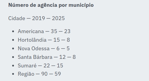 A RPT (Região do Polo Têxtil) perdeu 31 agências bancárias entre 2019 e 2025, uma redução de 34,4% no número de unidades físicas. O total caiu de 90 para 59 nas cidades de Americana, Hortolândia, Nova Odessa, Santa Bárbara d’Oeste e Sumaré, segundo levantamento do Dieese (Departamento Intersindical de Estatística e Estudos Socioeconômicos) com base em dados do Banco Central.