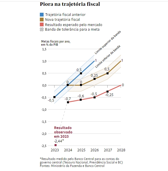 Os números sinalizam uma flexibilização em relação à promessa feita no ano passado, na apresentação do novo arcabouço fiscal, de entregar um superávit de 0,5% do PIB no ano que vem e alcançar um resultado positivo de 1% do PIB já em 2026, último ano de mandato de Lula. (Fonte: Folha de SP)