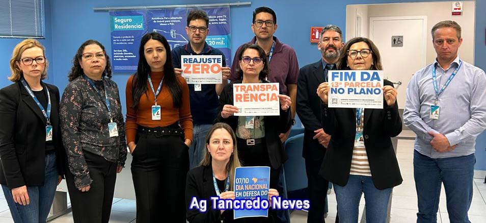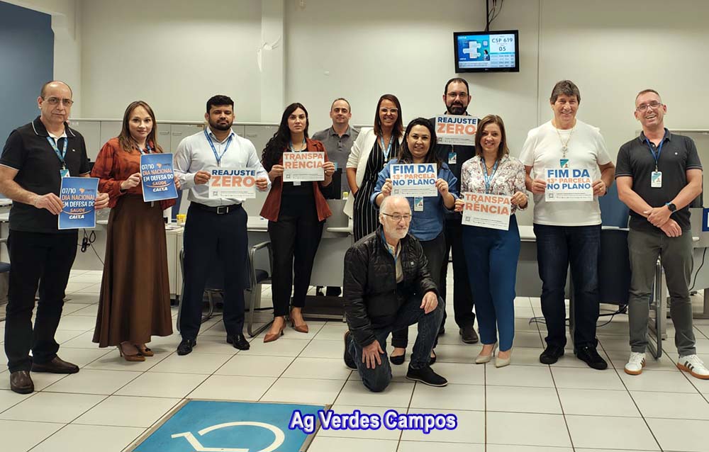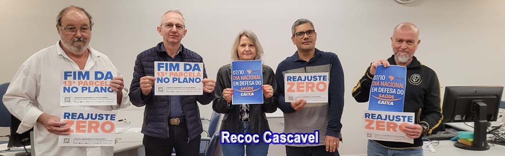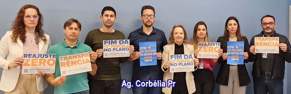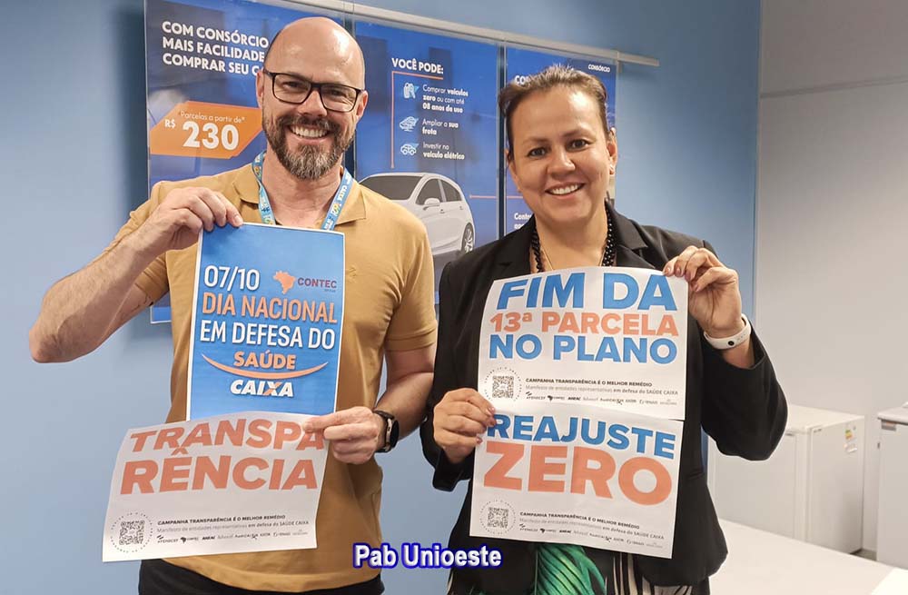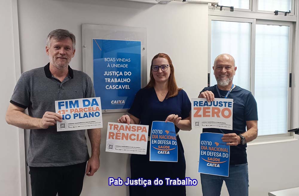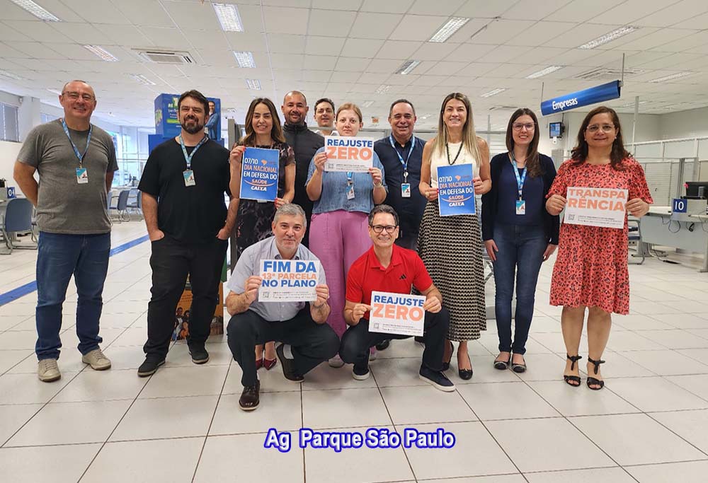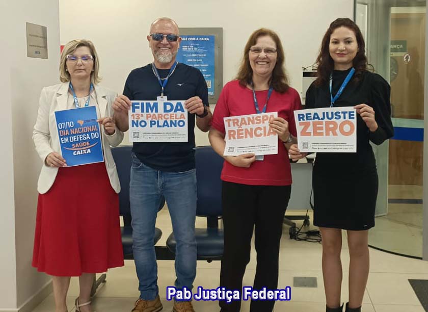 Durante este dia de mobilização, diretores do Sindicato de Cascavel e empregados da Caixa estão usando cartazes com os dizeres “07/10 – Dia Nacional em Defesa do Saúde Caixa”, “Fim da 13ª Parcela no Plano”, “Transparência” e “Reajuste Zero”. (Fonte: Seeb Cascavel - Fotos: Divulgação)