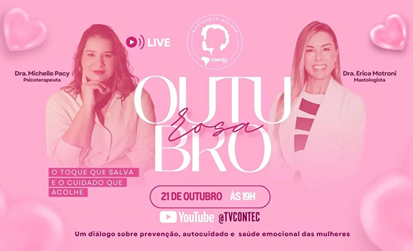 O Movimento Mulher CONTEC promove, nesta terça-feira, 21 de outubro, às 19h, uma live especial em alusão ao Outubro Rosa, com o tema “O toque que salva e o cuidado que acolhe”.O encontro reunirá a médica mastologista, Dra. Érica Motroni, e a Dra. Michelle Pacy, psicoterapeuta, em um bate-papo informativo e acolhedor sobre prevenção, diagnóstico precoce e saúde emocional das mulheres.A Diretora de Finanças da CONTEC, Leiza Torres, fará a abertura do evento, destacando a dedicação da CONTEC à saúde e ao bem-estar das trabalhadoras.As convidadas abordarão os sinais de alerta para o câncer de mama e os impactos emocionais que acompanham o processo de diagnóstico.